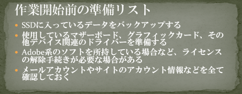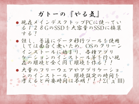 と言う事で、改めましてSSDへのOSクリーンインストールからの環境構築についてレビューを進めて行きたいと思います。