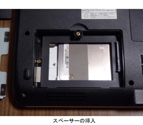 ノートパソコンを逆さまにして、HDDを固定しているネジを外していきます。予習した効果もあって、換装作業は問題なく進んでいきます。HDDを取り外し……さて、スペーサーは何かで固定しなければならないのでしょうか?