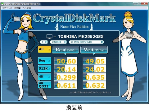 CristalDiskMark Nano Pico Ediitionを使ってベンチマークを行いました。SATA2で接続しているために製品がもつ本来の性能は発揮されていませんが、すべての検査項目で劇的な改善が見られます。