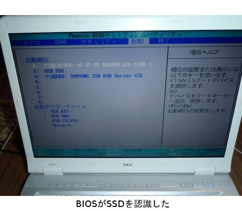 という訳で、スペーサーは挿入するだけで、SSDの向きを確かめつつパソコンに接続。カバーを閉めたあと、BIOSを起動してSSDが認識されることを確認します。