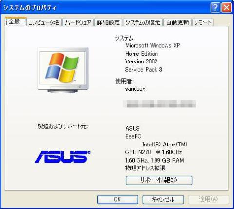 EeePC 1000H-Xの環境は下記のとおりです。
