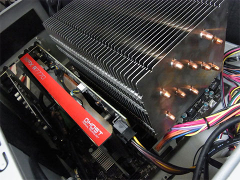 そしてCPUクーラーは巨大なオロチ。MicroATXケースの容積の何割かを食いつぶしている上に、VGAとかなり近いl。今までこのファンレスコンビを排気ケースファンによる負圧エアフローのみで冷却していたといういろんな意味でムチャしやがってな構成だ。