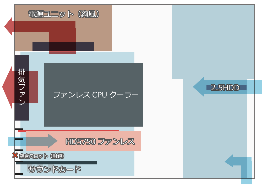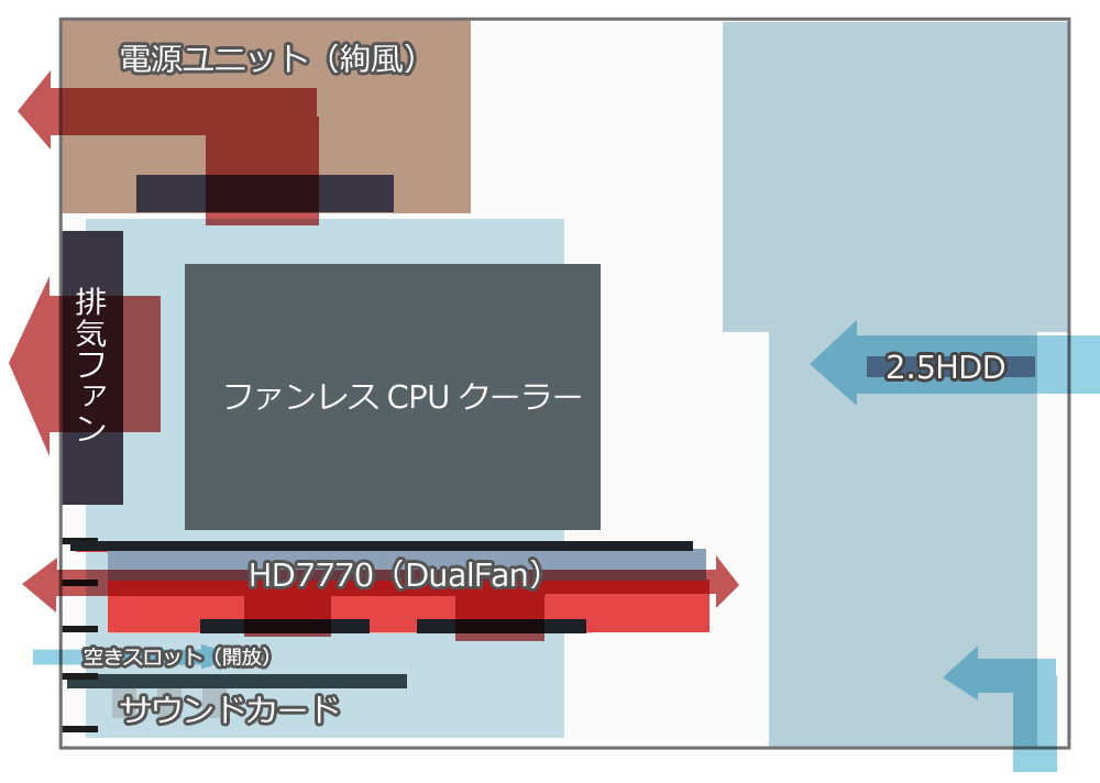 ぶっちゃけ図に書いたようなエアフロー気にする必要なかったかな?いずれ直下のスロットを目張りした場合変化があるのか試してみたいところだ。