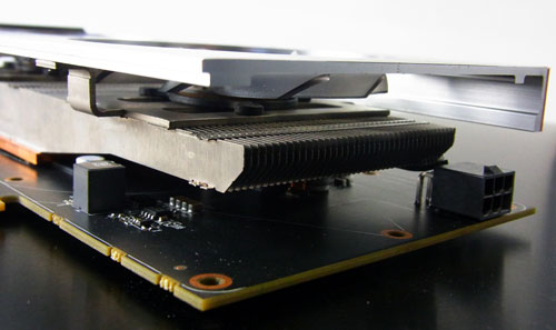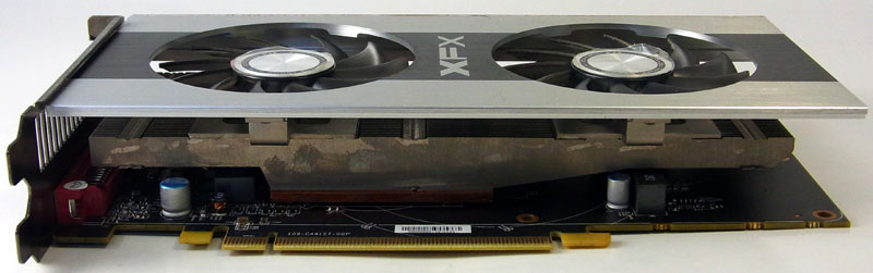補助電源コネクタは他のHD7770同様1個。殆どコネクタの為に基盤を延長しているような感があり、コネクタ周囲の基盤はスッキリしている。 こうしてみると基盤・ヒートシンク・天板の3段重ねに見える。お前は空母赤城(改装前)か。