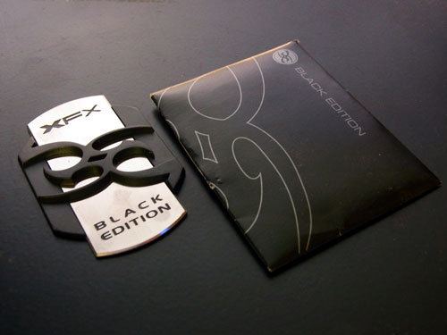 付属品はドライバ・マニュアル類に加えてBLACK EDITIONのロゴが付属。XFXで選別されたチップの証らしい。ミドルレンジながら雰囲気の盛り上げ方はまるでハイエンド。