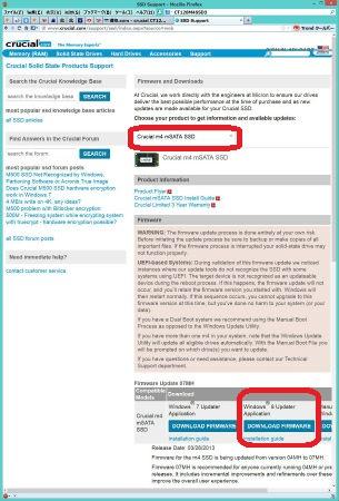Crucial SSD Supportページのページで「Firmware and Downloads」の場所で「Crucial m4 mSATA SSD」を選択する。