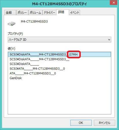 デバイスマネージャーでCT128M4SSD3のプロパティを確認した所、見事に「07MH」にアップデート完了です。