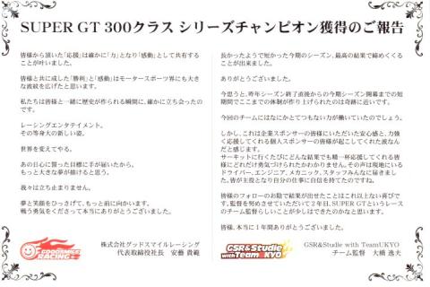応援実り...そしてそのあとお礼の葉書が送られてきた。ひょっとしたら、スポンサーにはどういう結果でもお礼状が来るのかも知れないけれど、cybercatの初めてのスポンサードで優勝なんて嬉しいじゃないですか!