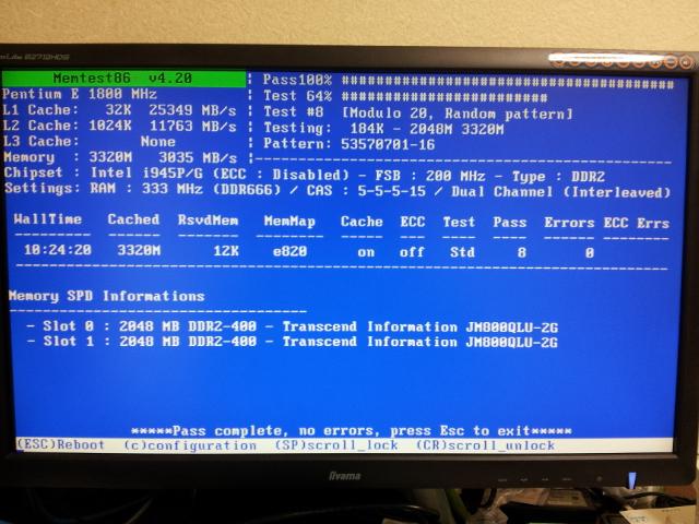 Memtest86 v4.20 10時間ぶん回した結果