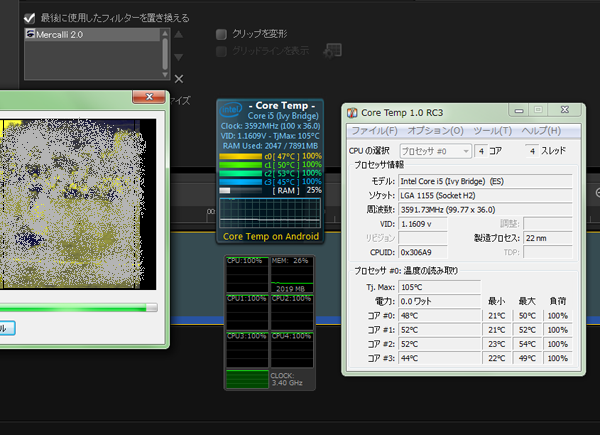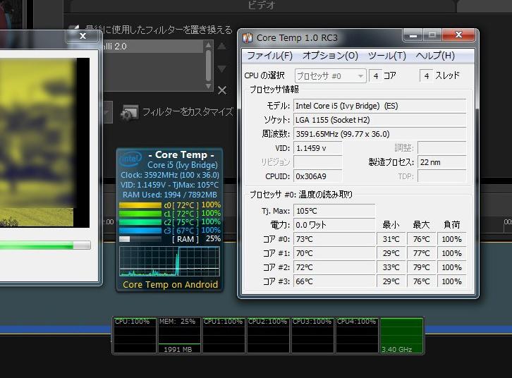 CPUに高負荷の掛かる「手ぶれ補正」時・・・以前は80℃に近かった温度が、交換