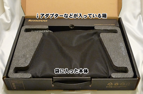 アダプタ・ノートPC本体・説明書のシンプルな内容物です。