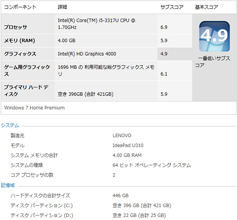 こちらのU310は500GB(5400rpm/シリアルATA/2.5 インチ)+32GB SSD Rapid Driveということで、ちょっと記憶域も見てみました。