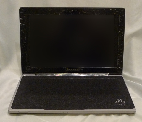 さらっとした心地よいさわり心地の表面に、ロゴが輝いています。もう少しロゴの部分がシンプルな方がよいかも。本体をあけると液晶保護のシートがあります。それをとってようやくご対面です。
