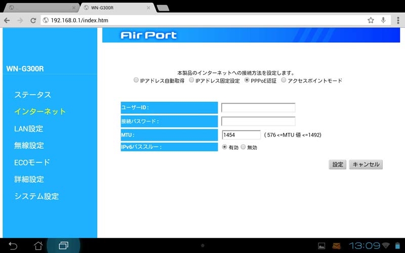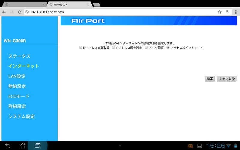 ↓タブレット端末から通常アクセスした場合の設定画面。