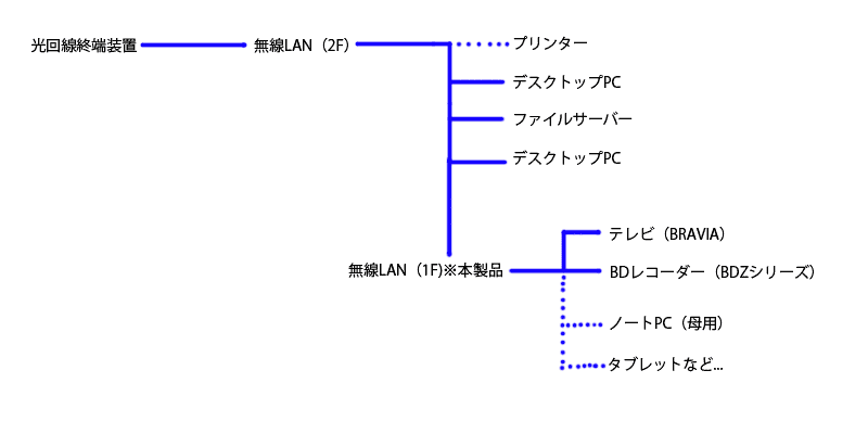 光回線終端装置→有線→無線LAN親機(2F)→有線→無線LAN親機(1F:今回のレビュー製品)