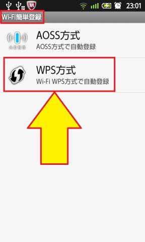 ③ Wi-Fi簡単登録画面が出たらWN-G300RのWPSスイッチをおして「WPS方式」を選択