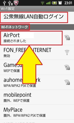 ④ 接続されると公衆無線LAN自動ログインに「AirPort***」が表示され、完了です。