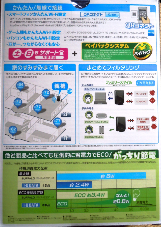 普段自宅のリビングで使っている WHR-G301Nとその後継モデルの消費電力 6Wに比べて、なんと 2.4Wとなっています。