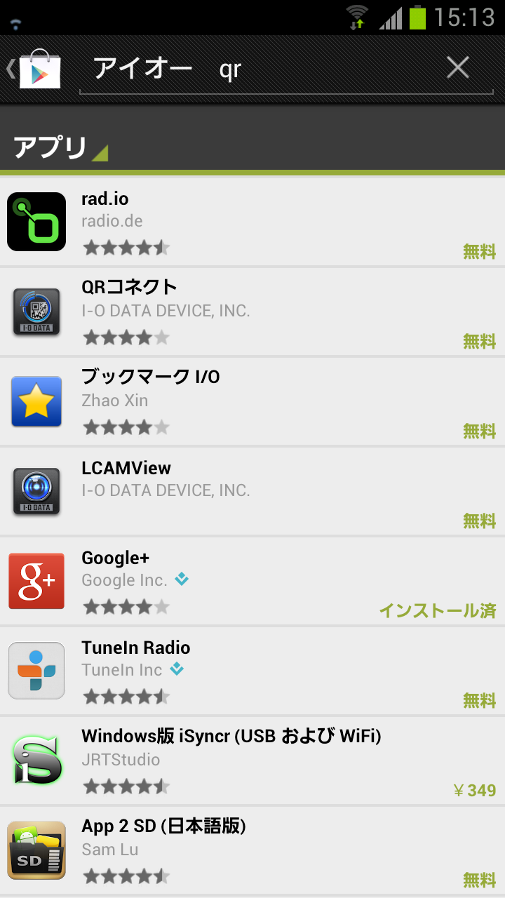 Play Storeにアクセスして、「アイオー qr」という言葉でキーワード検索しました。