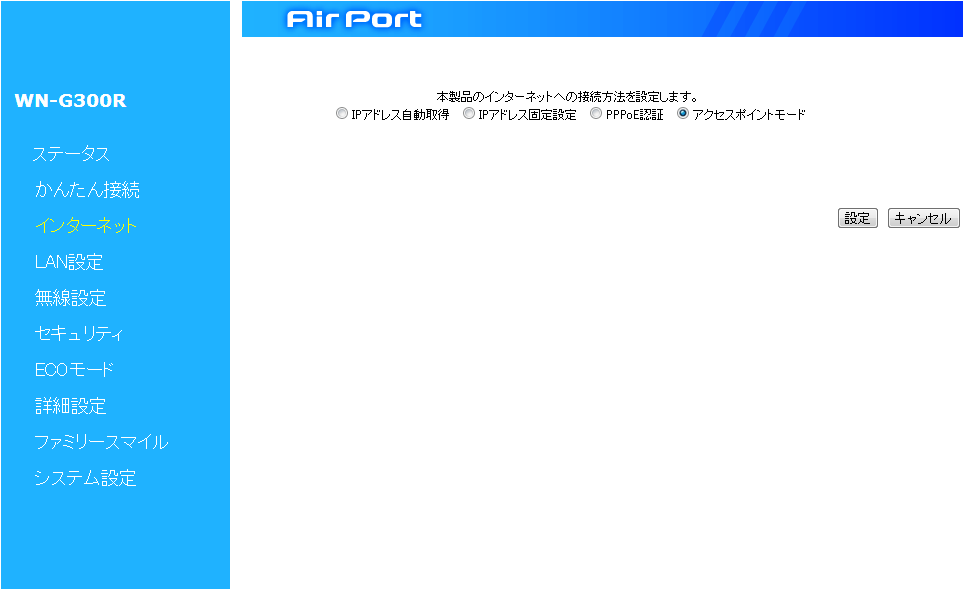 左側のインターネットをクリックすると、選択肢が現れますので、アクセスポイントモードにして設定を押すと再起動します。