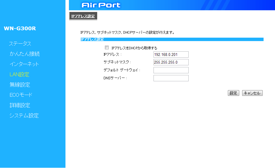 他の AirPort製品同様 初期値が 192.168.0.201 になります。