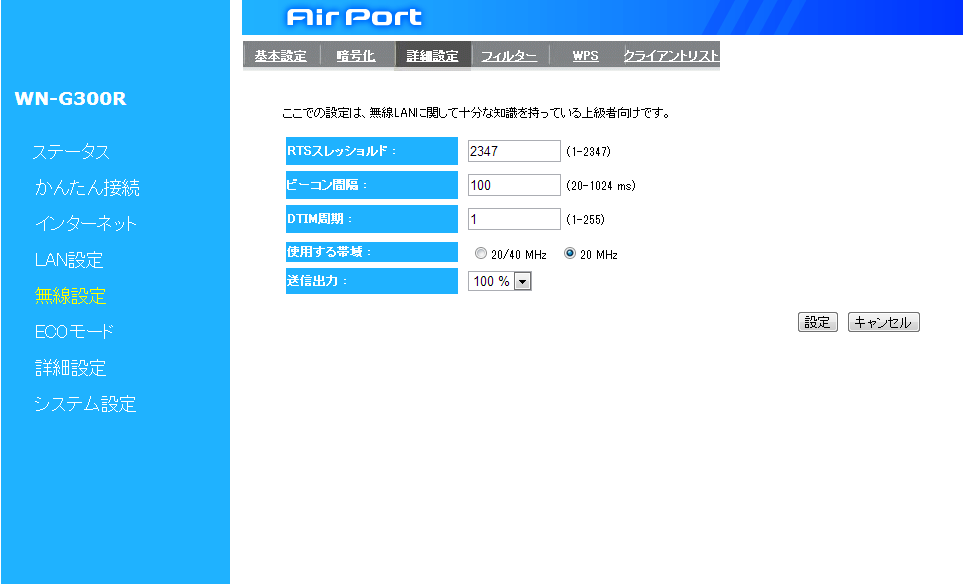 無線設定→詳細設定の 使用する帯域で変更できます。既定は20MHzです。