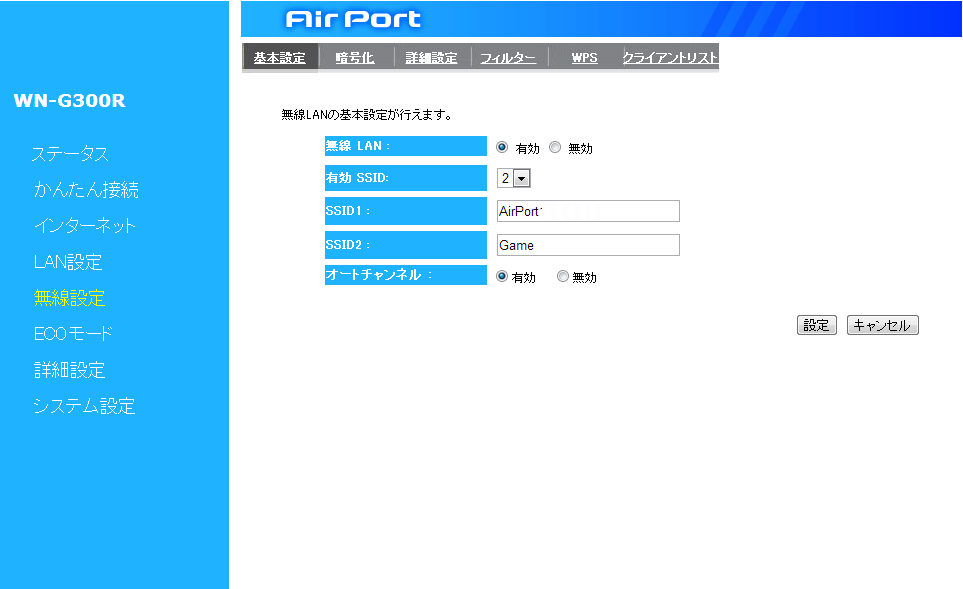 SSID1とSSID2を好きなものに変える場合には、無線設定→基本設定から変更します。