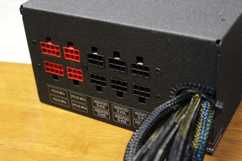 この手のモデルであれば少なくともプラグインだろう、ということで最低限のケーブルは付属してる状態なのかな?と思ったら手持ちのCorsair HX750と同じ様なセミプラグイン(必ず使うATX24pin,CPU8pinなどは直付け、その他SATAなどはプラグイン)だった。