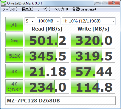 CrystalDiskMarkでも、ランダムアクセスでほぼ公称値となる500MB/sを出しています。