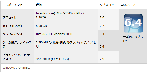 性能は期待通りです。Windows 7 エクスペリエンスインデックスでは最高値の7.9でした。
