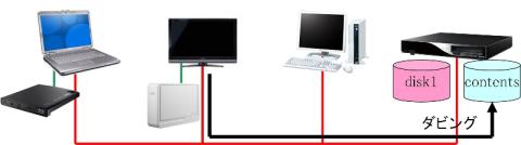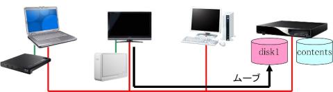 ムーブ(disk1)は、REGZAにUSB-HDDを接続して録画するのと同等(ただし、2番組録画はできない)で、他の機器からは見ることができません。共有フォルダとしての動作となります。
