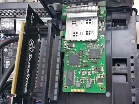 このケースに入れているので、ボードの向きを変えるライザーカードに刺さってます