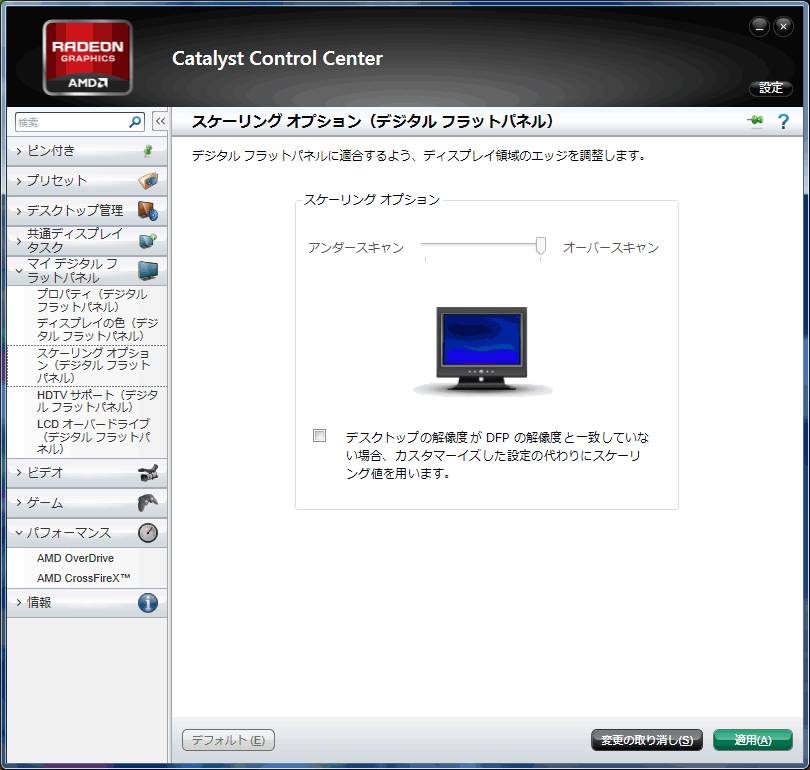 スケーリングオプションをオーバー側0%まで持っていくと見事フル画面表示になりました!
