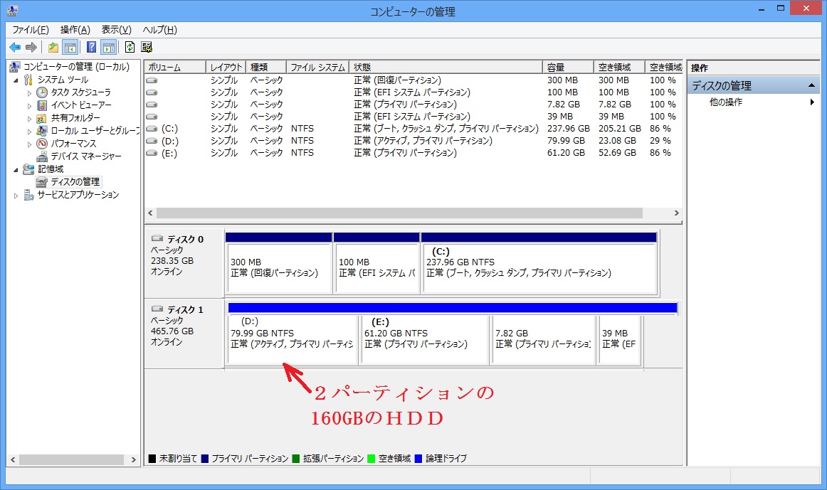 【実験】 (1)2個のパーティションが作成されている「160GBのHDD」の