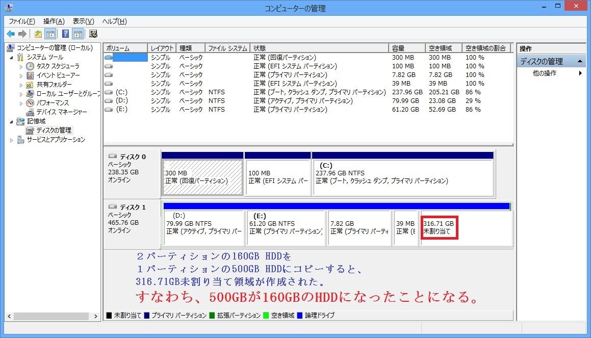 コンピュータの管理の中身は、クローン前後のHDDの状態を