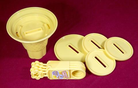 持ち手になるプッチンバーが 4本とプリンを受ける皿が 大 1つに小 3つ、それと食べる時にコーンカップのように使えるプッチンスタンドが付属します。