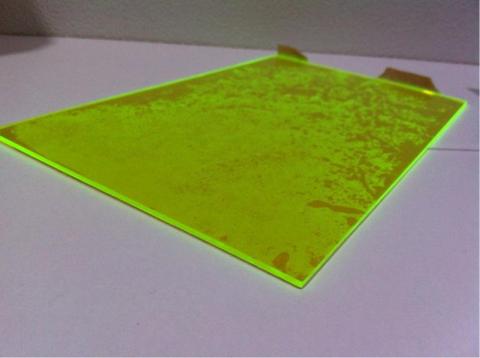蛍光色のアクリル板はカット面が発光したように見えます(写真の通り)。アクリル板にひっかき傷を付け、斜めから光を当てると浮き出したように光ります。