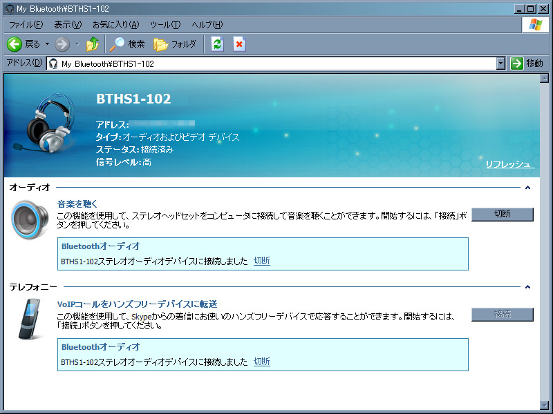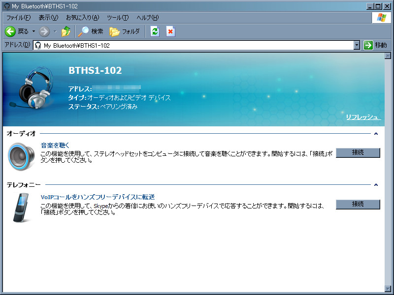 音楽再生をする場合は上の接続ボタンを、ハンズフリー通話をするには下の接続ボタンを押下します。しばらくするとつながった旨のメッセージが出ます。