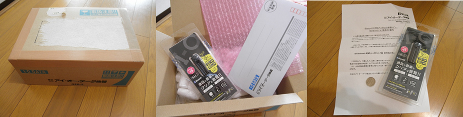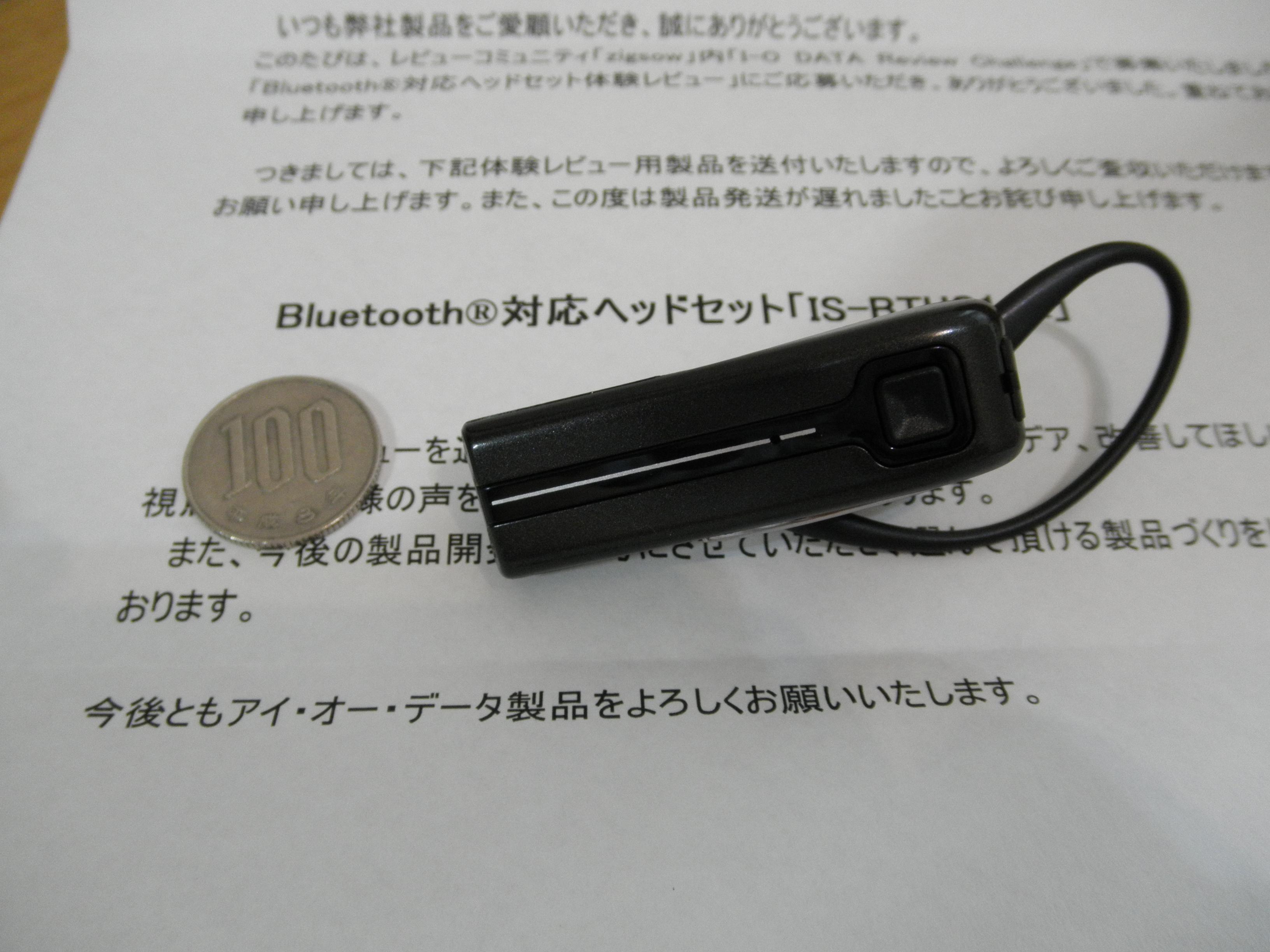 やっと100円玉大きさ比較でサイズがわかる....非常に小さないブリスターパックで我が家にやってきたIS-BTHS1/Kですが、見た目はかなりオーソドックス。でも生まれて初めてのBluetooth 3.0 ヘッドセット!