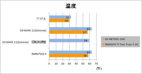 一方、N560GTX-Ti Twin Frozr II OCは負荷時でも60℃を越えることが無く、冷却性能は優秀であることがわかります。ただ、先ほどの静音性では負荷時に風切り音が聞こえてきたので、クーラーを静音性ではなく冷却性能寄りに振っていることがうかがえます。