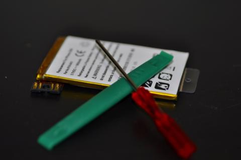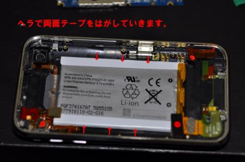 6.内臓基盤を外すと、バッテリーが出てくるので、両サイドを付属の緑のヘラでグイグイやると固定している両面テープがはがれるので、取り外し、バッテリーを交換します。