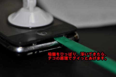 3.液晶画面に吸盤を貼り付け、面が浮いてきたら付属の緑のヘラでてこの原理で持ち上げます。