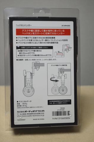 オーディオテクニカのAT-HPH300 ヘッドホンハンガーでデスクや棚の下に収納できる360度回転機構。ヘッドバンドを傷付けないレザー調のソフトクッションを採用。オーバーヘッドタイプなどでは特に重要な部分となるヘッドバンド。ハンガー部にはレザー調のソフトクッションを採用し、大切なヘッドホンをしっかりと保管できます。※対応するヘッドバンドの幅は最大50mmまでです。デスクなどの厚さに応じて取り付け部を調整可能。さまざまなデスクや棚など対応できるよう、取り付け部には調整機構を採用。最大35mm幅まで対応可能です。<テクニカルデータ>質量 約90g 耐荷重 約1kg ハンガー部(掛ける所の部分)は180度部分で軽くロックします 90度向きでは角度を帰られますがロックしません 思ったより大きなものでした。
