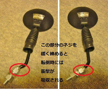 下記の部分のネジを少し緩めにするると曲がってくれて、転倒時には折れる事は少ないでしょう、多分ね。
