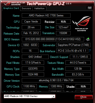 Vapor-Xの7770モデルで、コアクロック1100MHz、メモリクロック5200MHzです。