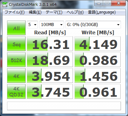 USB2.0のメモリなので、USB3.0ポートで使っても大差なしですね。