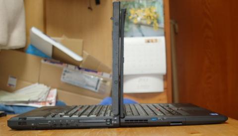 実際に使ってみても、想像していた通りの良さで、1600×900という大画面機なのに、パームレストを軽く持つだけで持ち運びができるというのは感動ものでした。一番上の写真の5年落ちくらいのT61(14ワイド)には、到底不可能な芸当です。