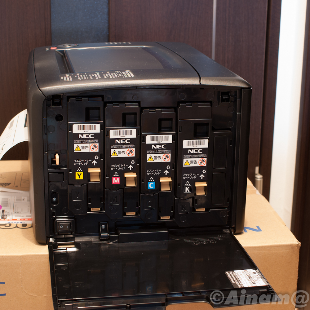 そこで、レーザープリンタなら空白期間が長くても、使えるのでは?と思い、購入してみました。 カラーレーザープリンタと言う事で、CYMKの4つのトナーカートリッジが装着されています。