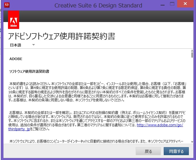 アドビソフトウェア使用承諾書に同意しますね。