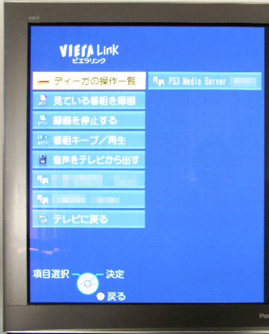 リモコン上のビエラリンクのボタンを押すと“PS3 Media Server”が認識されているので、後は再生したいメディアファイルを指定するだけであった。